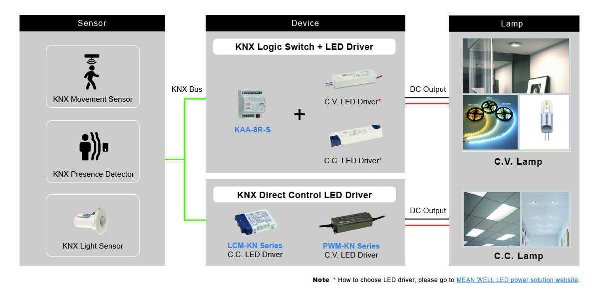 MEAN WELL KNX actuator can be connected to various sensors and detectors on the market and matched with various Constant Voltage (C.V.) and Constant Current (C.C)  LED driver products to meet the needs of different application scenarios.