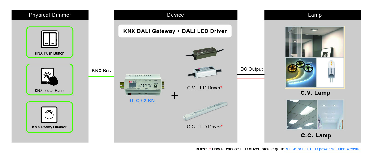 For example, users can choose a KNX touch panel, matched with to a KNX-DALI gateway; then, connect it to a DALI Constant Current (C.C) LED driver, switching or dimming control the Constant Current (C.C) driven LED spotlight.